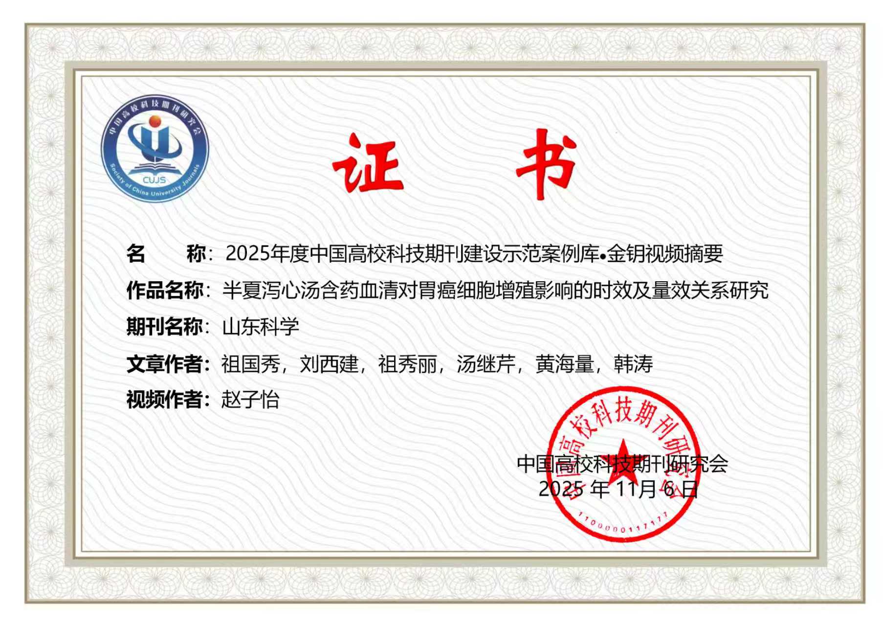 The video abstract "Study on the Time Effect and Dose Effect Relationship of Banxia Xiexin Tang Drug containing Serum on the Proliferation of Gastric Cancer Cells" submitted by Shandong Science (published in the first issue of Shandong Science in 2025, authored by ZU Guoxiu, LIU Xijian, ZU Xiuli, TANG Jiqin, HUANG Hailiang, HAN Tao) has been included in the key database case.