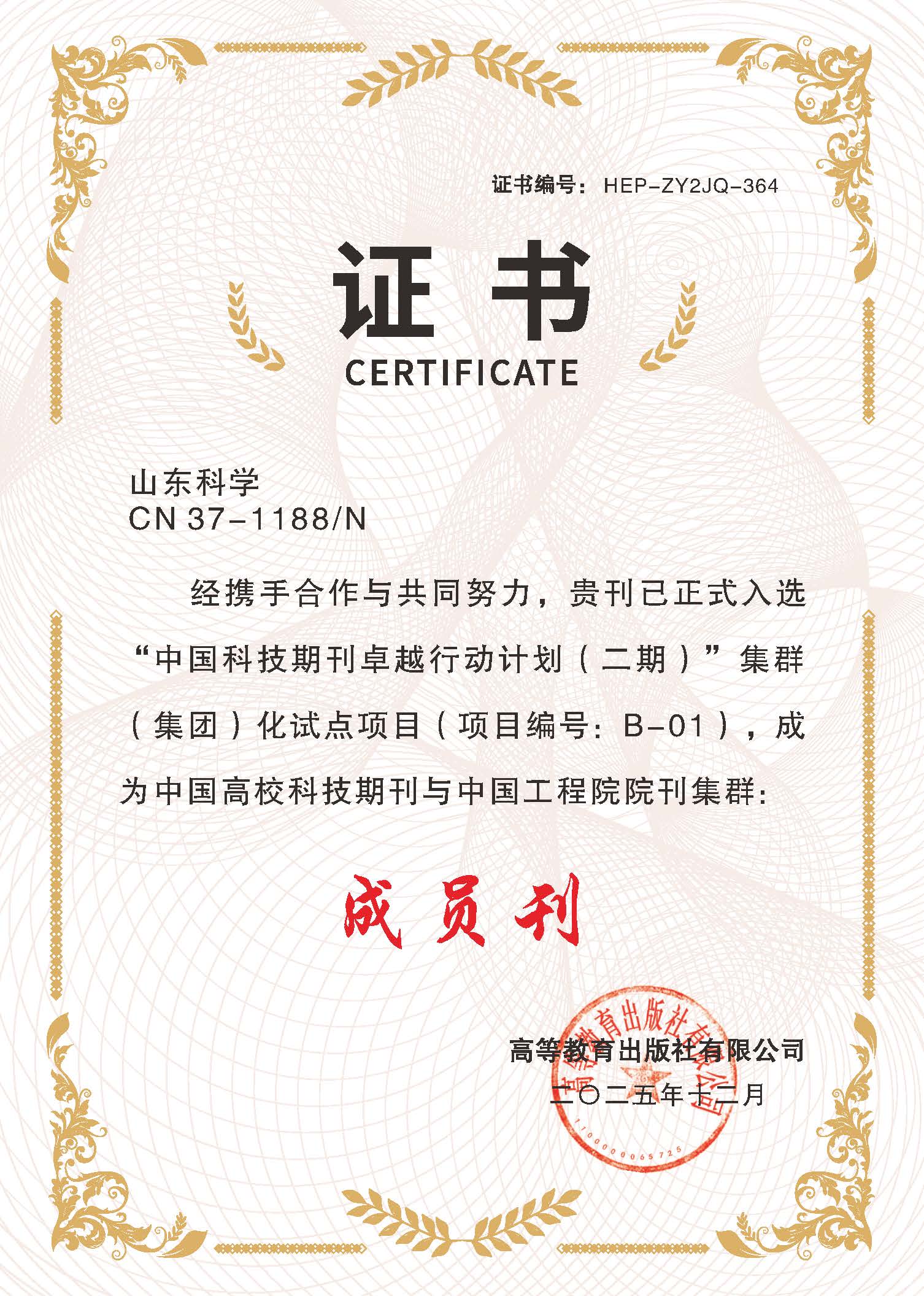 Shandong Science and Journal of Qilu University of Technology were selected for the "China Science and Technology Journal Excellence Action Plan (Phase II)" Cluster (Group) Pilot Project (Project No. B-01), becoming member journals of the "China University Science and Technology Journals and Chinese Academy of Engineering Journal Cluster".